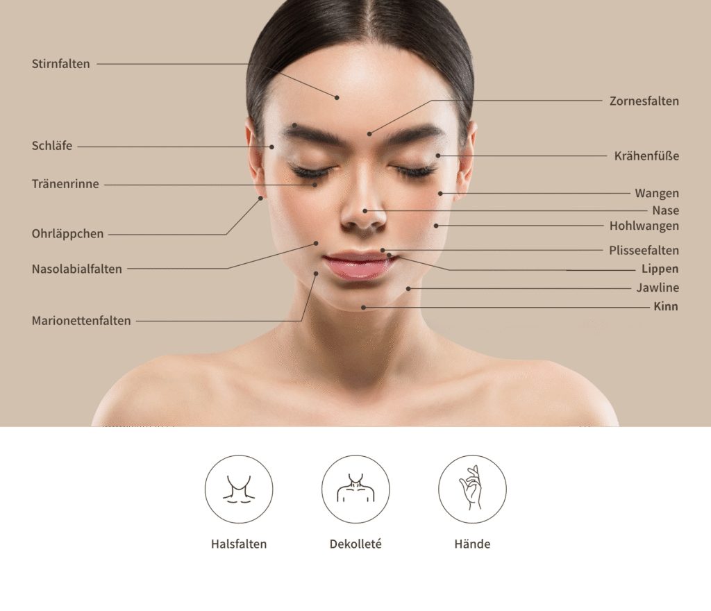 Hyaluronsäure ist ein natürlicher Bestandteil unserer Haut, der mit der Zeit abnimmt und so die Entstehung von Falten begünstigt. Bei der Hyaluron-Behandlung wird Hyaluronsäure gezielt in die mittleren bis tiefen Hautschichten injiziert, wo sie viel Feuchtigkeit bindet und das Gewebe sanft aufpolstert.